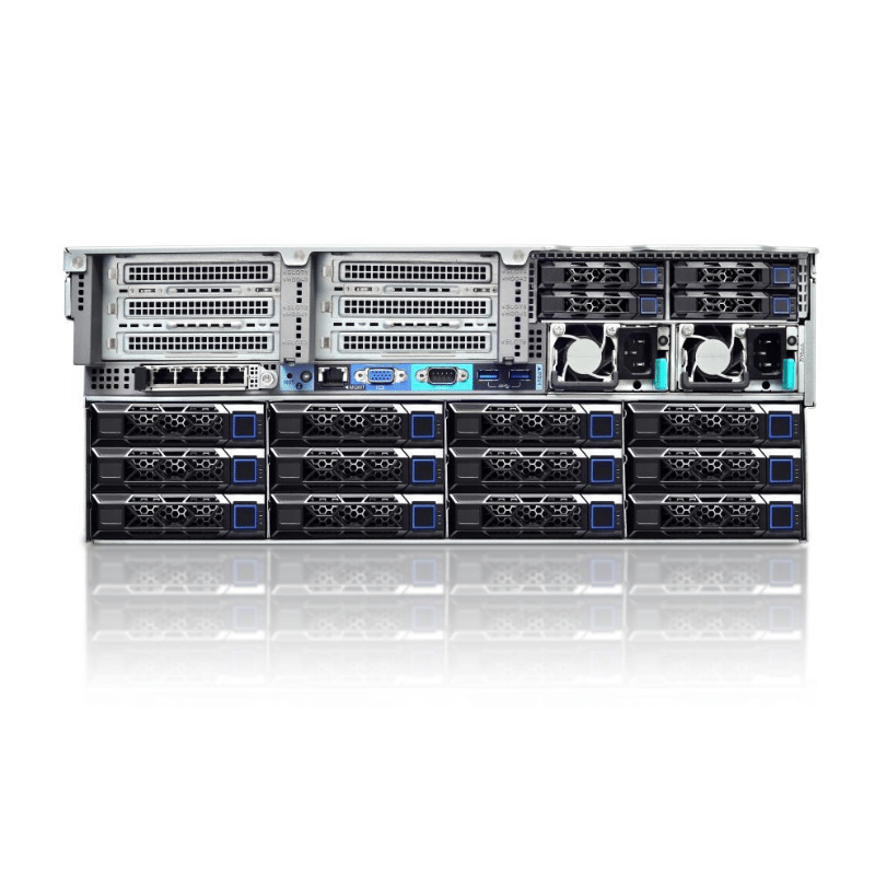 Rear: Supports up to 12 3.5-inch SAS/SATA hard drives, 2 2.5-inch SAS/SATA hard drives, and 4 2.5-inch SAS/SATA/NVMe hard drives