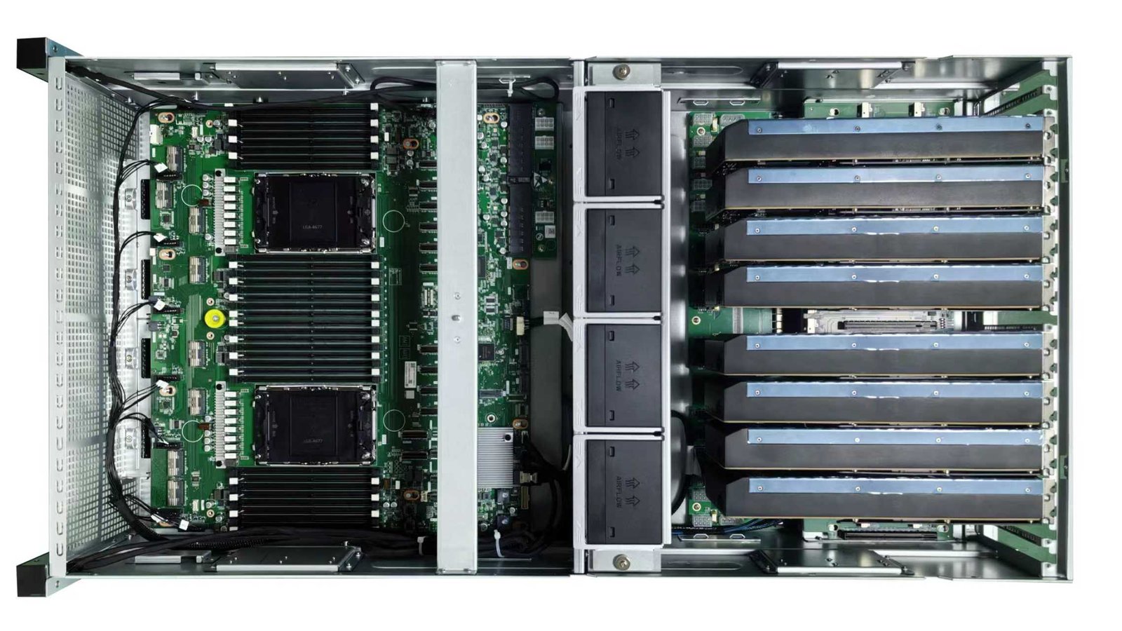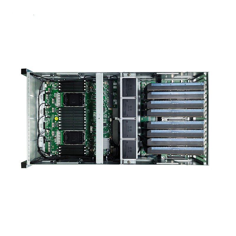8 emplacements GPU double largeur : Prend en charge jusqu'à 8 cartes GPU haute performance (par exemple, NVIDIA H100, A100 ou équivalent), idéales pour le traitement parallèle dans les flux de travail AI/ML.
