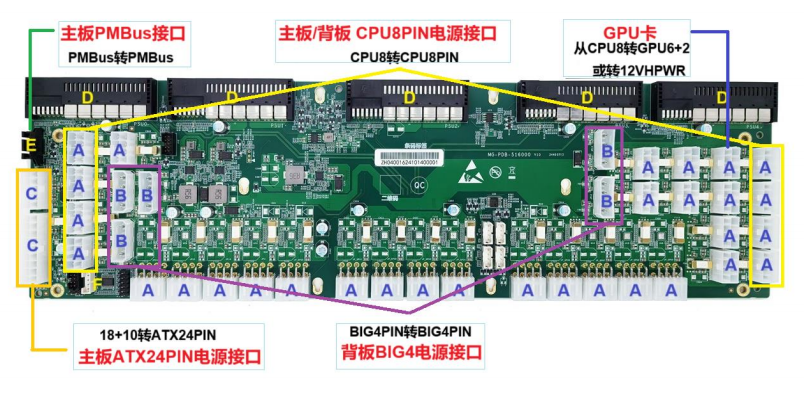 Dtype Big 4PIN Connectors (Point B): Connect directly to hard drive backplanes with Dtype 4PIN cables for stable storage power.