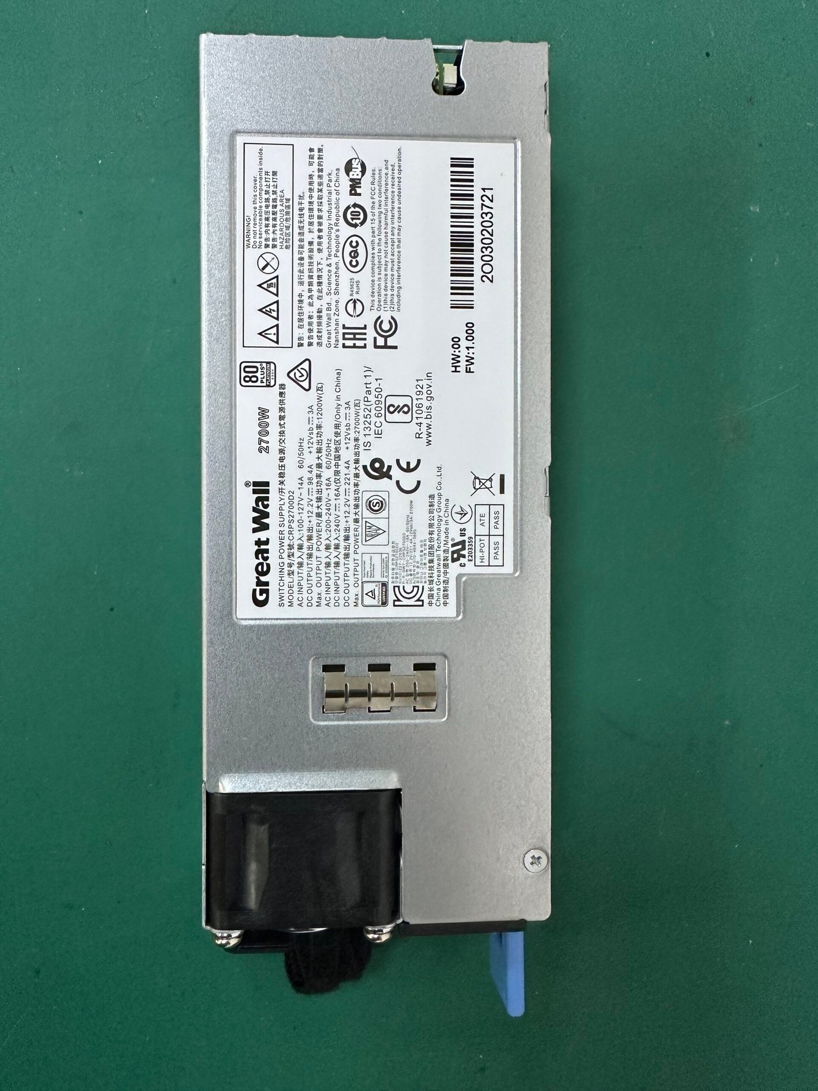 The CRPS2700D2 can deliver up to 2700W of output power, providing a stable +12V voltage with an output current range from 1A to 221A, accommodating various load demands. Its advanced voltage regulation technology guarantees that output voltage remains within specified limits under both dynamic and static load conditions, ensuring stable operation of connected devices. Furthermore, the power supply features good dynamic response capabilities, quickly adapting to load changes to meet instantaneous load demands.